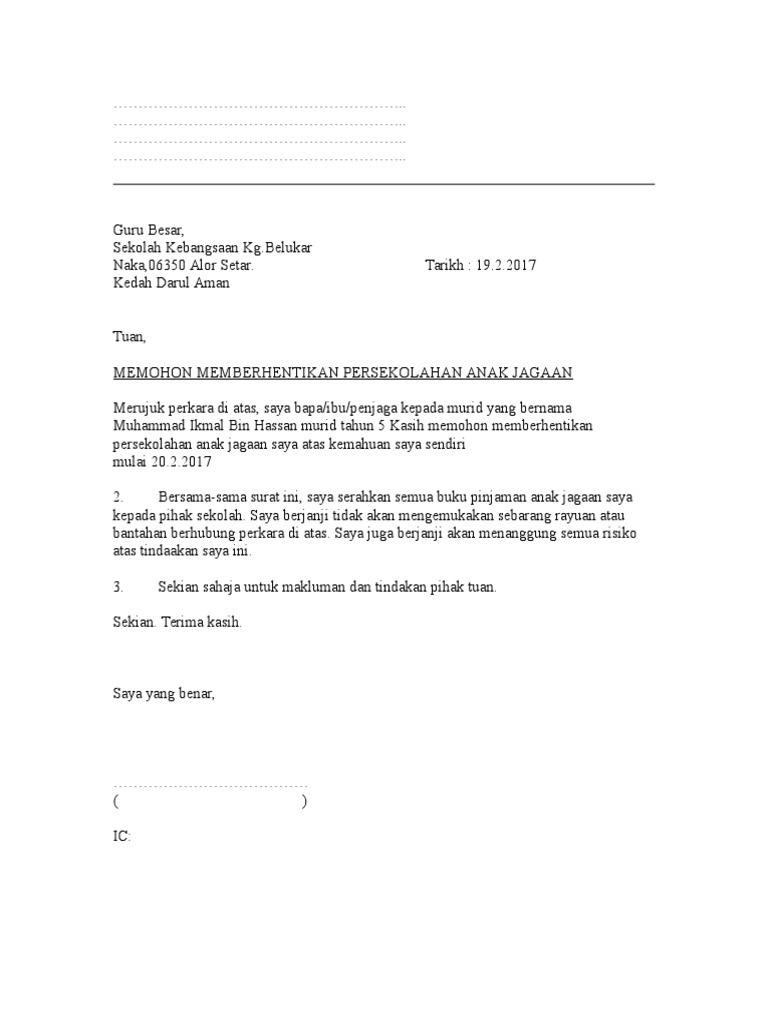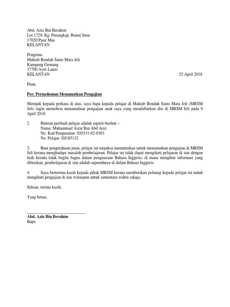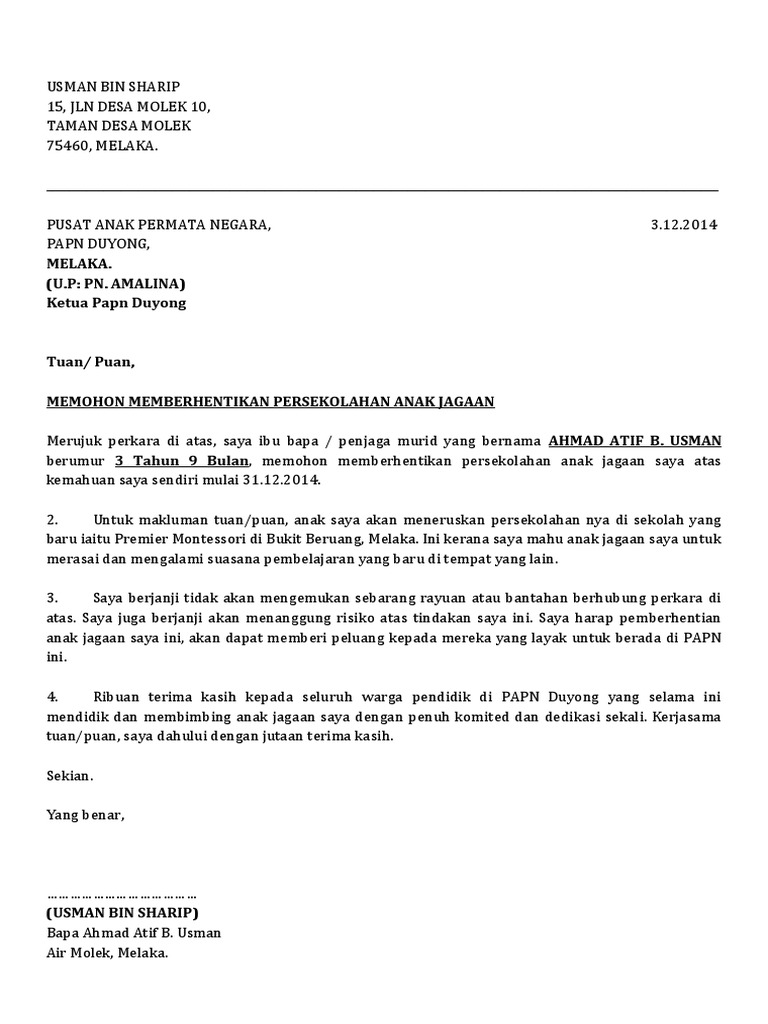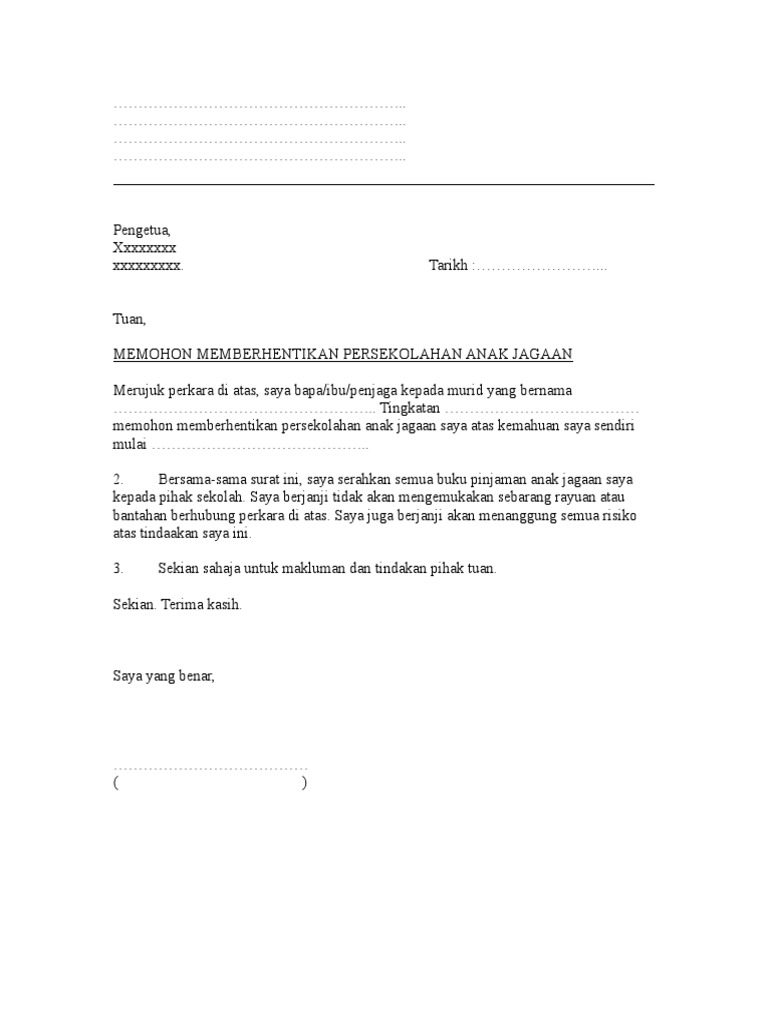 . Contoh surat rasmi memohon. Contoh surat berhenti sekolah. Download view surat berhenti as pdf for free.